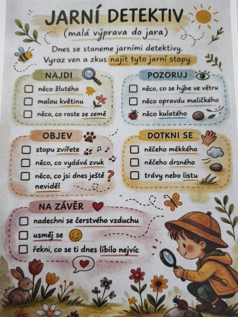 V pátek 20.3. jsme vyrazili přivítat jaro přímo detektivně. Pozvali jsme i naše malé kamarády z dětského klubu U Benyho. Na společné vycházce jsme hledali věci z živé a neživé přírody a plnili různé zajímavé úkoly. Počasí nebylo úplně jarní, ale ani štiplavý větřík nás neodradil od našeho pátrání.