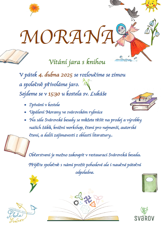 Přijďte se s námi v pátek 4. 4. 2025 rozloučit se zimou a přivolat jaro. Začínáme v 15:30 u kostela sv. Lukáše ve Svárově. Pokračovat budeme utopením Morany ve svárovském rybníce, za zpěvu písní přineseme líto ke škole. Nakonec se přesuneme do sálu Svárovské besedy, kde si budete moci zakoupit výrobky žáku, ale také nově bude probíhat Vítání jara s knihou (knižní workshop – jak se vyrábí kniha, nakladatelství 2veverky vám také nabídne knihy pro děti, autorské čtení a další zajímavosti z oblasti literatury). Těšíme se na společně strávené odpoledne.